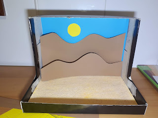 Ana tamén estivo traballando no minimundo do deserto. Xa ten o fondo e mailas dunas. Xa podemos ir polo seguinte paso.